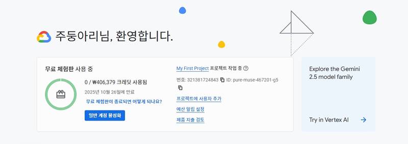 대시보드 상단에 “무료 체험판 사용 중”이라는 문구와 함께 300달러 크레딧이 자동 지급된 것을 확인할 수 있습니다. 이때 “일반 계정 활성화” 버튼은 절대 누르지 마세요. 이 버튼을 누르면 유료 플랜으로 전환될 수 있습니다. 실수로 눌렀더라도 크레딧을 모두 사용하기 전이라면 추가 요금이 청구되지 않으니 참고하세요.