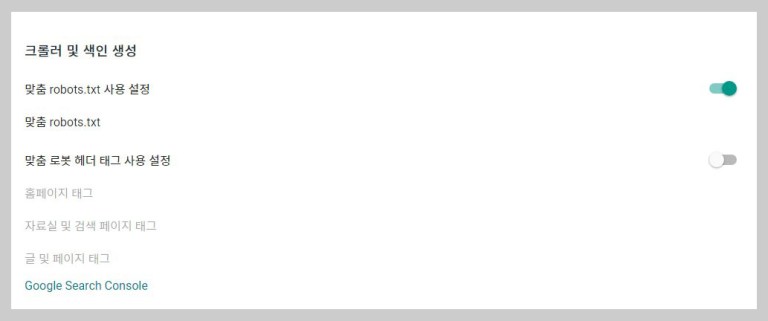 • 구글 서치콘솔에 크롤링을 위해 맞춤 robots.txt 사용 설정을 활성화 합니다.